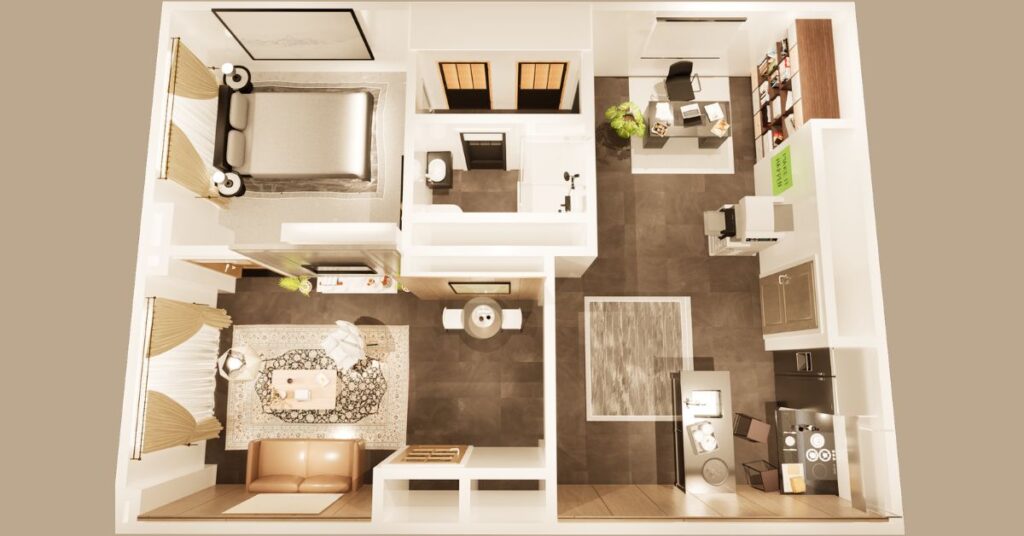 A rendered floor plan is a three dimensional representation of the architectural design, containing necessary interior and architectural elements.